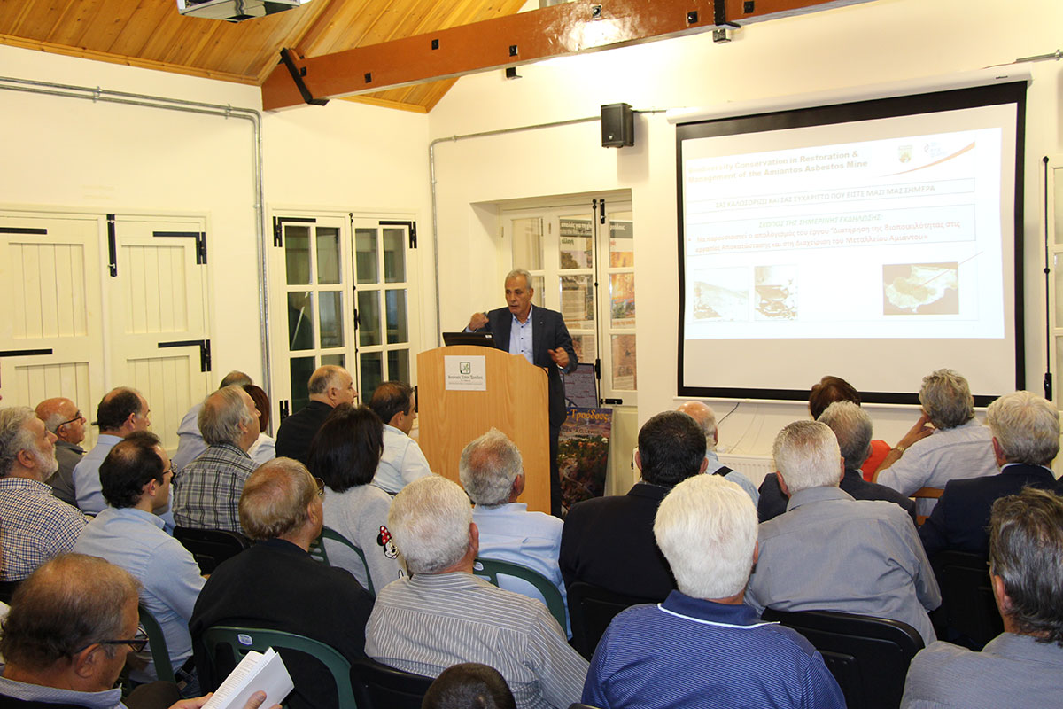 On Saturday, 29 April 2017, the final information event of the project “Biodiversity Conservation in Restoration and Management of the Asbestos Mine” was organized in the Visitor Center of the Troodos Botanical Garden, in the Amiantos Asbestos Mine. The event was addressed by the President of the Community Council of Amiantos Village, the General Director of the General Directory for European Programmes, Coordination and Development and from the Minister of Agriculture, and Environment (represented by the Director of the Geological Survey Department). After the greetings, the project coordinator, Chief Conservator of Forests Mr. Takis Tsintides, presented the project. The event included a short tour in the artificial lake during which the guests had the chance to have a close look to the project works and was concluded with a meal at the café-restaurant at Platania Forest Station